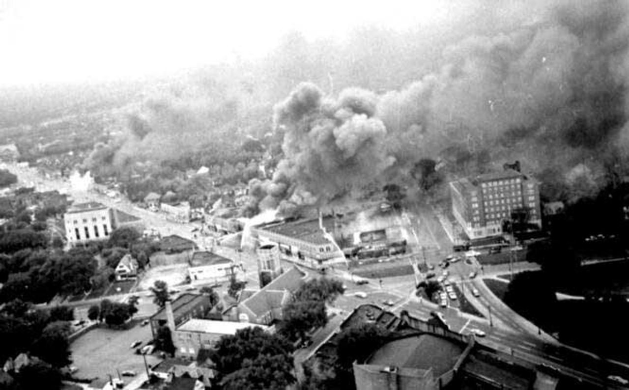 By mid-afternoon, a half-dozen fires had been reported. Twenty-five mile-per-hour winds spread the fires from one building to the next. Firefighters called onto the scene were pelted with rocks and bottles.
