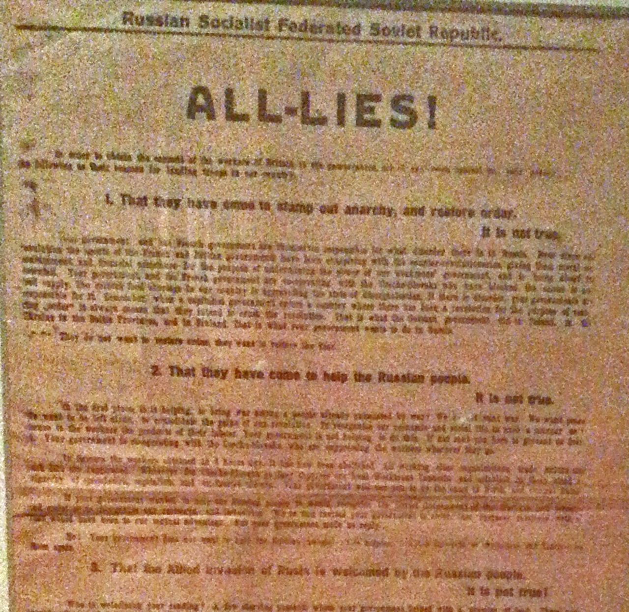Again, the sources speak with more historical truth and power. On display in this section is a leaflet headed, “All-Lies” . It was distributed by the Red Army to intervening British soldiers, exposing their government’s true motivations and the lies told about the Bolshevik regime.