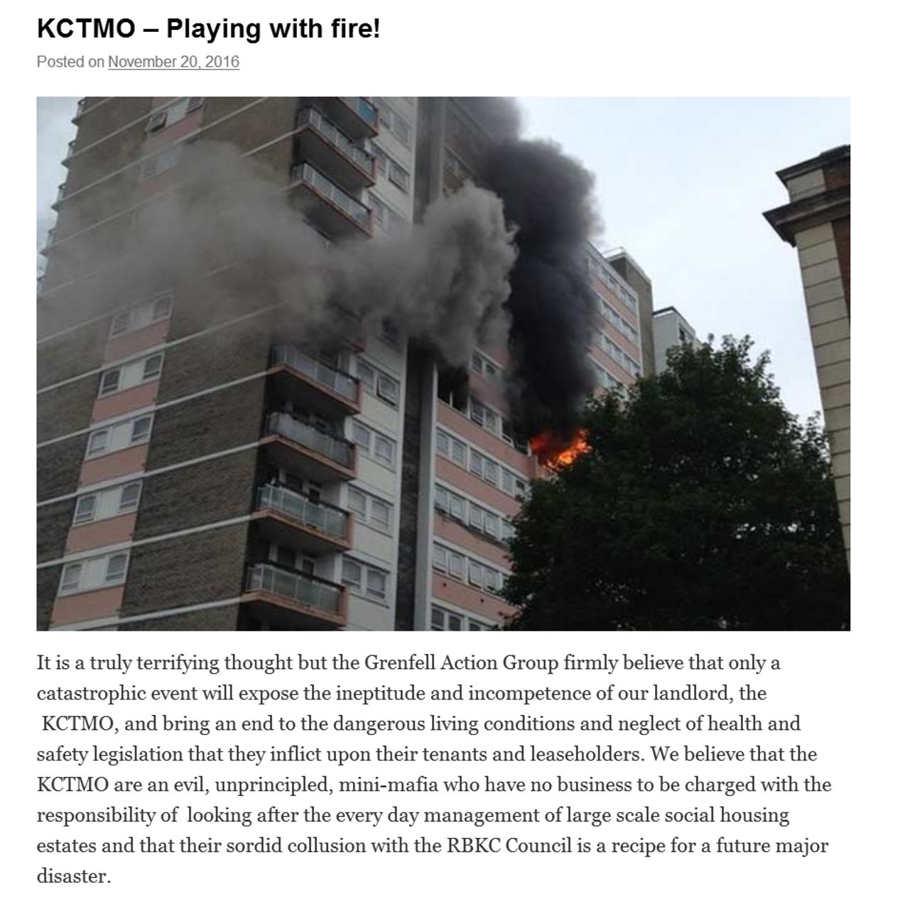 - “It is a truly terrifying thought, but the Grenfell Action Group firmly believe that only a catastrophic event will expose the ineptitude and incompetence of our landlord, the KCTMO, and bring an end to the dangerous living conditions and neglect of health and safety legislation that they inflict upon their tenants and leaseholders.”