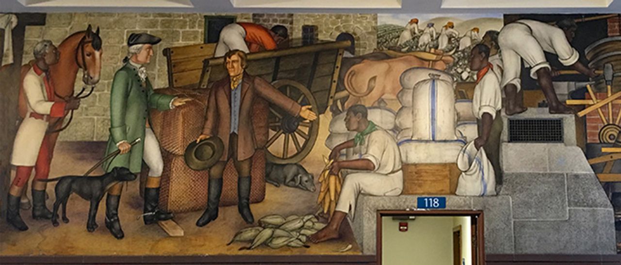 In the second controversial mural, slaves belonging to George Washington are shown working in the fields at Mount Vernon, Washington’s estate in Virginia, and presumably being bought or sold at auction. In other words, Arnautoff’s work was hardly hagiographic. It attempted to present the contradictory reality of early American life.