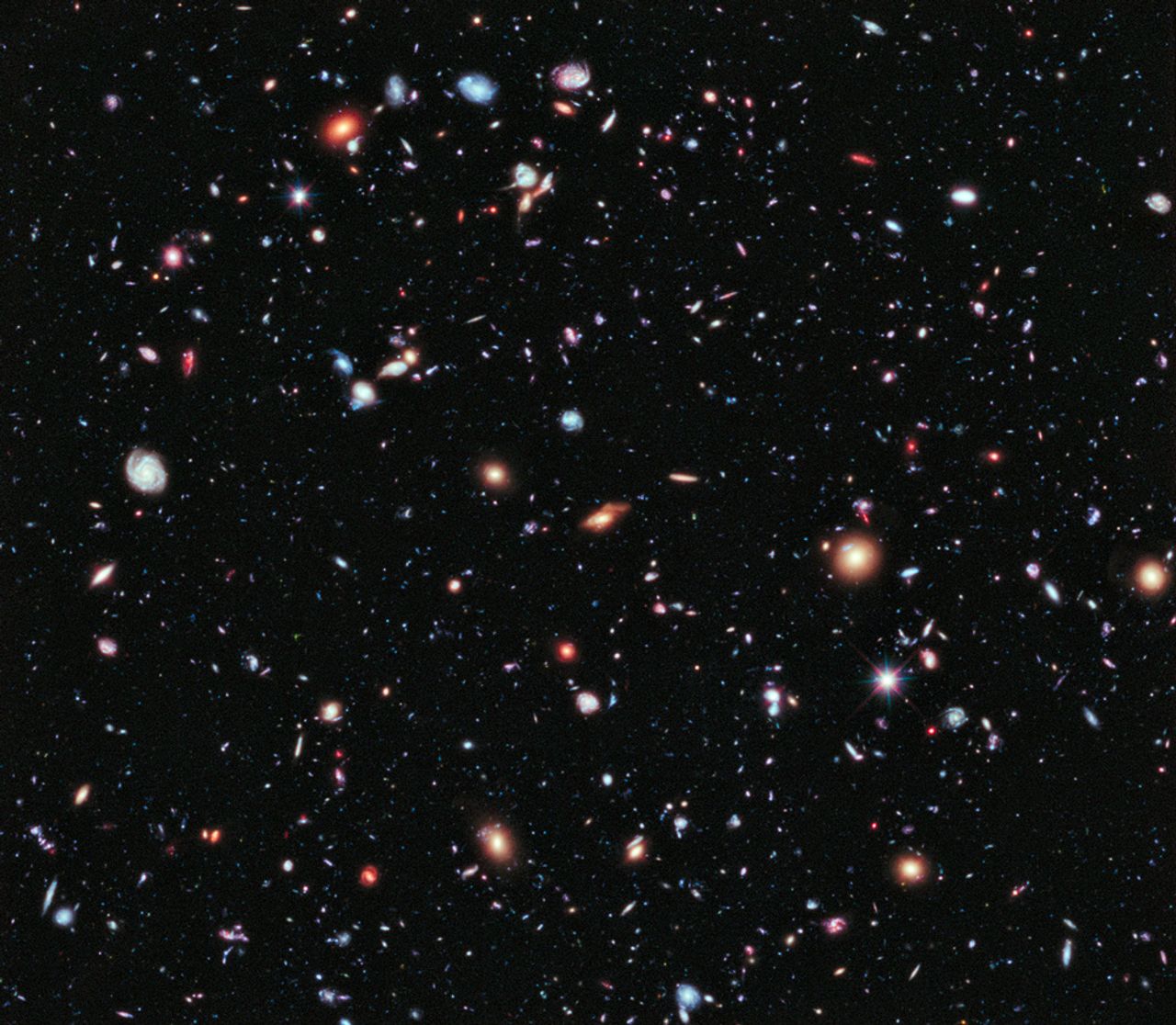 In that minute region of space, Hubble revealed to astronomers and the public alike just how large space is. About 3,000 distinct galaxies were observed in the images, each containing tens of billions of stars, with spiral, irregular and elliptical galaxies all present. The study provided the first in-depth look at the early universe, seeing galaxies as far as 12 billion light years away and thus—since light takes time to travel through space—galaxies as they were 12 billion years ago. Astronomers were astonished by the number and variety of young galaxies Hubble revealed.
