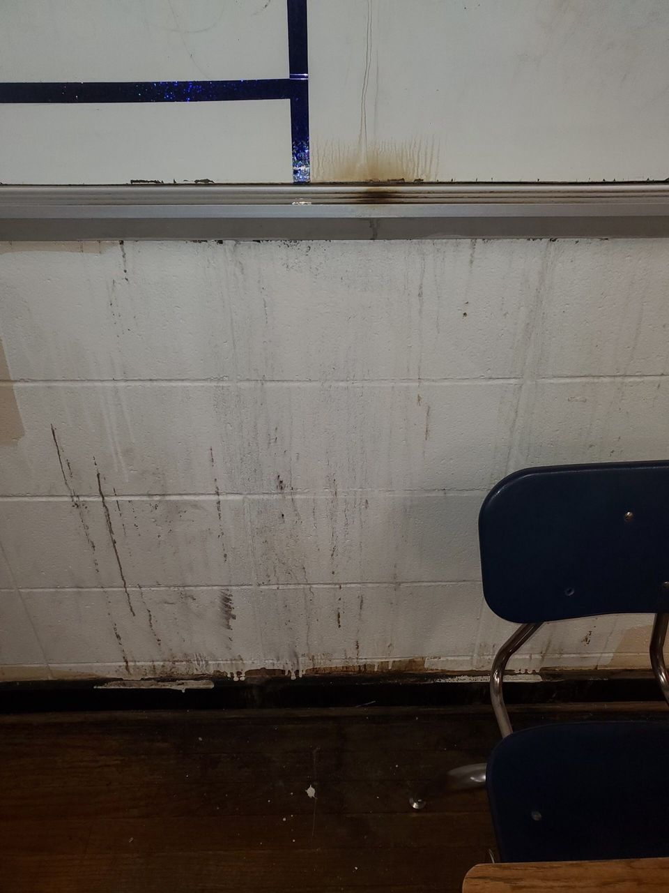 Erica: I have mold in my classroom. I’ve tried to paint over it with white paint. We just had our roof fixed last year. Every time it would rain there would be puddles in my classroom. It made my white board bubble up. The floor is stained with mold. A year or two ago I started getting migraines. Someone said it might be because of the mold in my classroom. I tried to keep my door open. We don’t have central air in our building. My classroom has a little air conditioner that they just put in, but a lot of classes don’t even have that. We have no hot water. The boys bathroom doesn’t even have doors on the stalls.