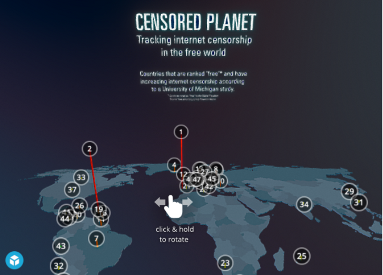 The Censored Planet automated monitoring platform is a novel approach to tracking online censorship. It uses public internet servers around the globe as data gathering nodes that monitor and report when access to websites is being blocked. It also uses artificial intelligence algorithms to filter the data, remove noise and recognize trends.