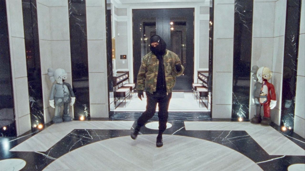 The music video opens with nighttime shots of a city in lockdown. It then cuts to the garish interior of Drake’s $100 million Toronto mansion (complete with an NBA regulation-size basketball court). Alone, wearing black gloves and a ski mask, the rapper proceeds to give a tour of his dreadful palace while performing the titular dance. The video ends with Drake dancing in front of a fireworks show in his backyard.