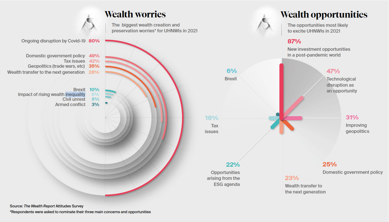 The report explains, “The 2021 instalment is based on responses provided during October and November 2020 by over 600 private bankers, wealth advisers, intermediaries and family offices who between them manage over US$3.3 trillion of wealth for UHNWI clients.”