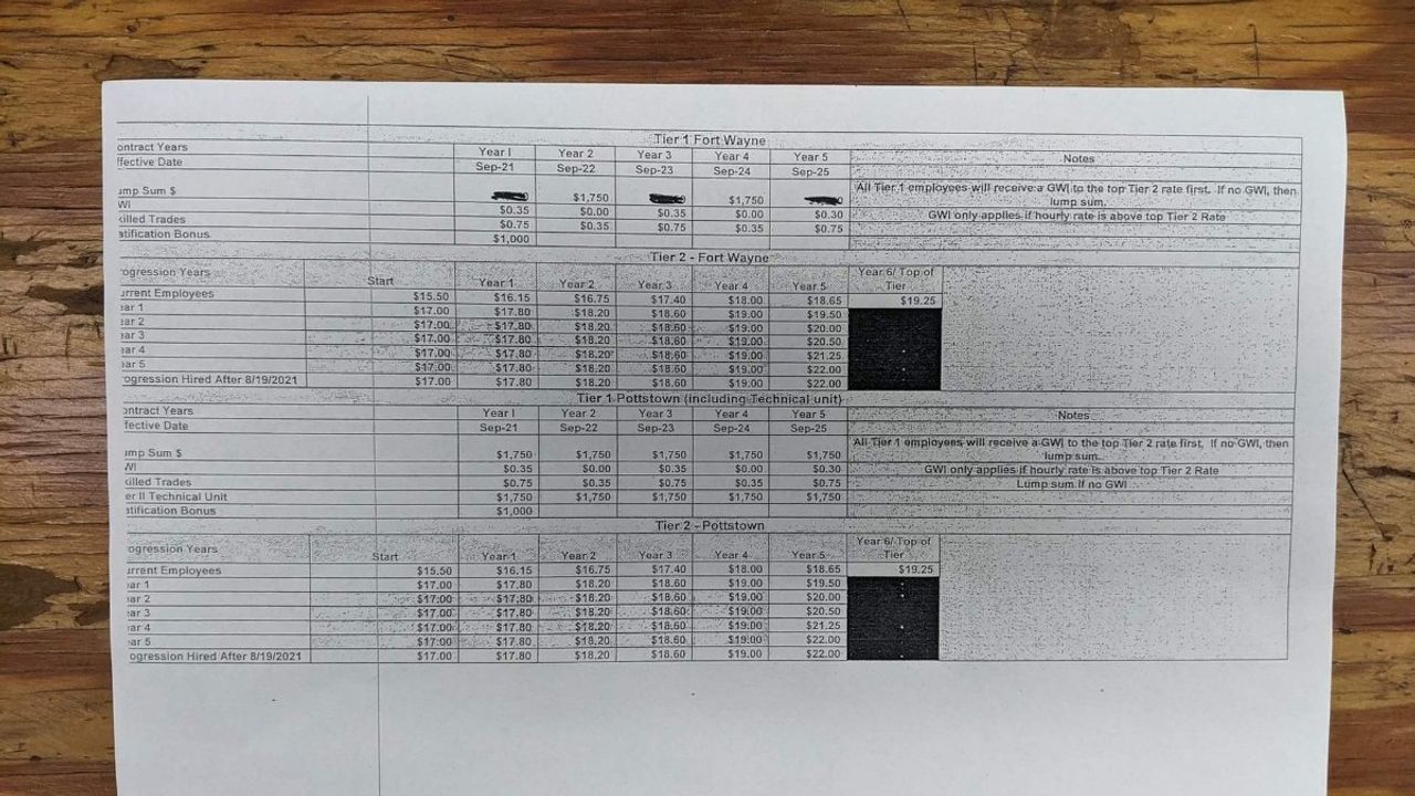 A leaked pay scale that includes figures for the Fort Wayne, Indiana and Pottstown, Pennsylvania plants shows pay for tier two will only increase between $0.40 and $1.00 each year through 2026. With inflation at 4 percent a year, this would effectively be a pay cut, and a massive pay cut if inflation and the cost of living rise higher. Tier two workers will top out at just $22 an hour. Current employees making $15.50 at present will make only $19.25 in year six.