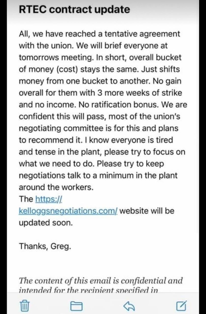 The email, first reported by Laina Stebbins of Michigan Advance, was apparently sent to several members of plant management. It declares, “In short, overall bucket of money (cost) stays the same. Just shifts money from one bucket to another.” It adds with malicious satisfaction, “No gain overall for them [Kellogg’s workers] with 3 more weeks of strike and no income. No ratification bonus.