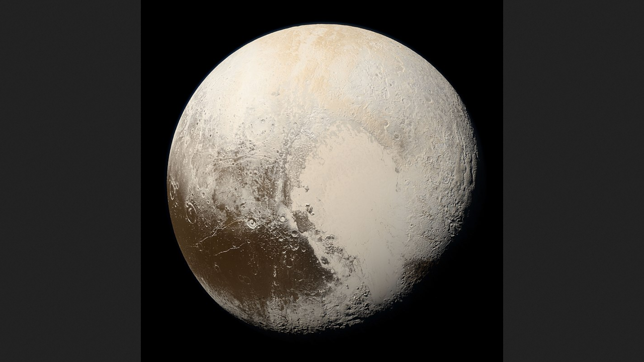 An image of Pluto captured by New Horizons during its flyby of the distant dwarf planet. Among the most striking feature on Pluto is the bright expanse of Pluto's icy, nitrogen-and-methane rich "heart," Sputnik Planitia.