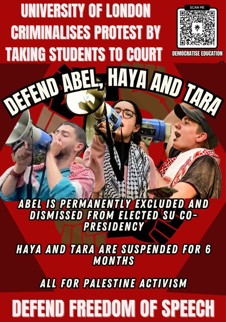 On October 28, University of London obtained an unprecedented High Court injunction naming Abel, Haya and Tara, alongside “persons unknown” and anyone involved with “Democratise Education”, from protesting on the university’s private land. It is the first such pre-emptive injunction to have been granted. As a result of this legal ruling, Tara and Haya, both fee-paying students, have been unable to access campus facilities for the entire academic year.