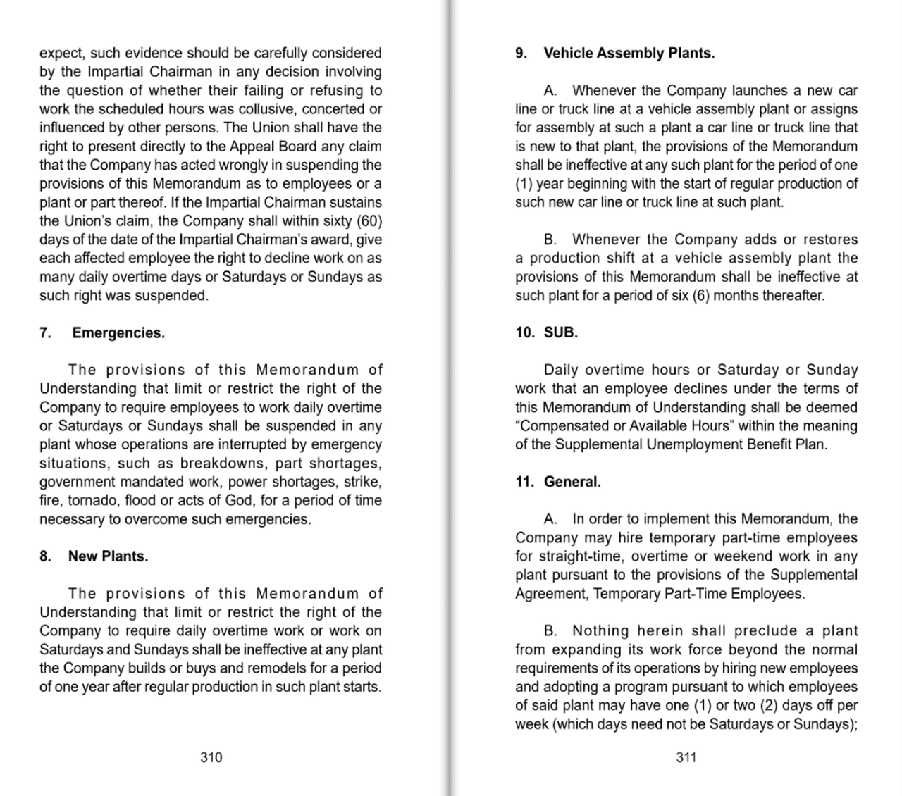 It states: “The provisions of this Memorandum of Understanding that limit or restrict the right of the Company to require employees to work daily overtime or Saturdays or Sundays shall be suspended in any plant whose operations are interrupted by emergency situations, such as breakdowns, part shortages, strike, fire, tornado, flood or acts of God, for a period of time necessary to overcome such emergencies.” It continues: “There shall be no strike, picketing or other concerted activity with respect to any dispute arising out of this Memorandum of Understanding.”