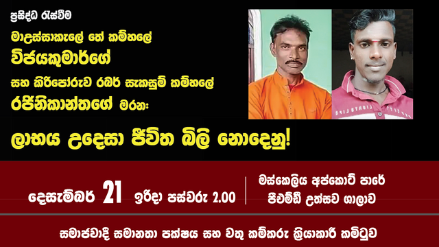 සමාජවාදී සමානතා පක්ෂය සහ වතු කම්කරු ක්රියාකාරී කමිටුව, “මාඋස්සාකැලේ විජයකුමාර්ගේ මරනය: ලාභය උදෙසා ජීවිත බිලි නොදෙනු!” යන මැයෙන් සංවිධානය කරන ප්රසිද්ධ රැස්වීම දෙසැම්බර් 21 වැනි දා මස්කෙලිය අප්කොට් පාරේ පීඑම්ඩී උත්සව ශාලාවේ දී දවල් 2ට ආරම්භ වෙනු ඇත.